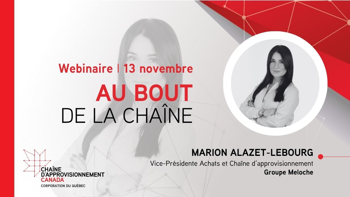 Le jeudi 13 novembre à midi, découvrez notre troisième webinaire de la série « Au bout de la chaîne » avec Marion Alazet-Lebourg, vice-présidente achats et chaîne d’approvisionnement chez Groupe Meloche, une PME aéronautiques en forte croissance.